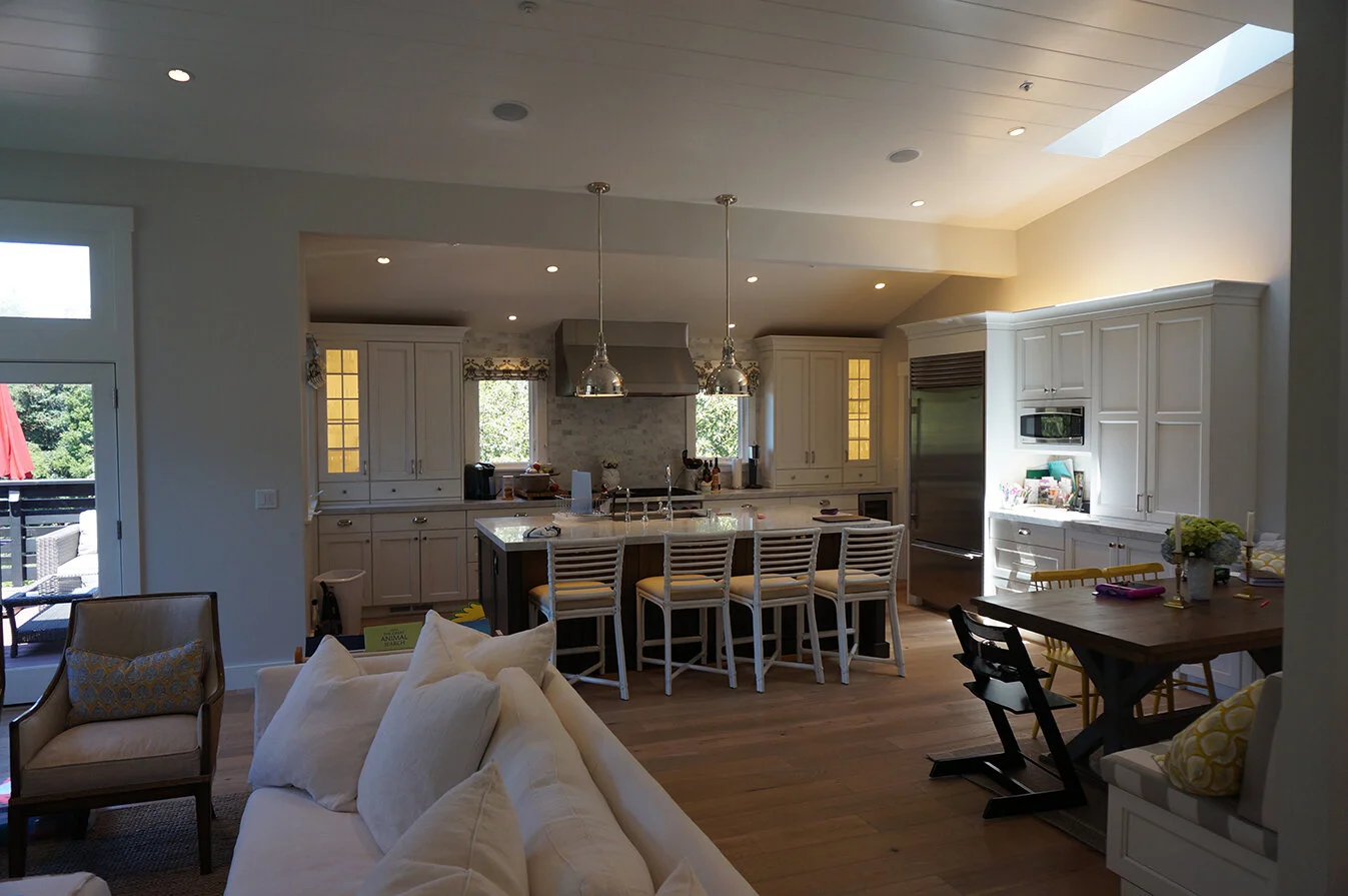 For this project, the lot coverage and FAR were already maxed-out so we were not able to add any additional square footage to the project. Thus, special attention had to be paid to the interior circulation and selection of finishes to give the interior as much spaciousness as possible without adding square footage. To do that we brought the eyes upward with a 1x8 v-groove ceiling at the great room vaulted ceiling which allows the light to bounce around the space. Then, by adding wood wainscots at strategic and built-in cabinets at strategic locations we were able to provide much needed storage space without compromising the circulation or spaciousness of the rooms. From there we articulated the formal living room with a flat coferred ceiling which gave the house a nice and cozy getaway that complimented the volume of the great room.